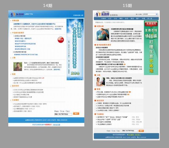 其實(shí)友商聯(lián)線15期和14期,在風(fēng)格設(shè)計(jì)上是近似的,都是商務(wù)風(fēng)格,簡(jiǎn)潔大方,藍(lán)色調(diào)子,右邊為廣告區(qū)域。視覺(jué)設(shè)計(jì)并沒(méi)有新的改觀和體驗(yàn)。