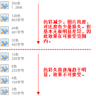 由此可見,上述四張圖中,在肉眼可辨識情況下,64色的圖片對比256色圖片,輸出后可以少掉一半還多的字節(jié)數(shù),且效果完全能滿足視覺要求。不要小看這幾百個字節(jié),試想網(wǎng)站里幾百張圖片,如果每張圖都節(jié)省一些,最終可以節(jié)省多少空間出來?