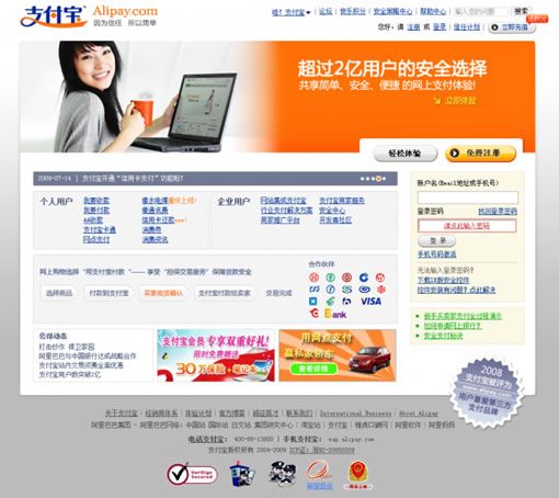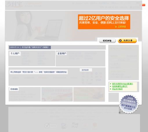 支付寶:大banner分為2塊,左邊是代表著用戶的大美女,右邊是體現(xiàn)實力的宣言“超過2億用戶的安全選擇”,輔助小字為:共享簡單、安全、快捷的網(wǎng)上支付體驗,具有親合力的美女,醒目的大標語,傳達給用戶的信息,支付寶的內(nèi)容構(gòu)思很明顯比財付通更直接有效。