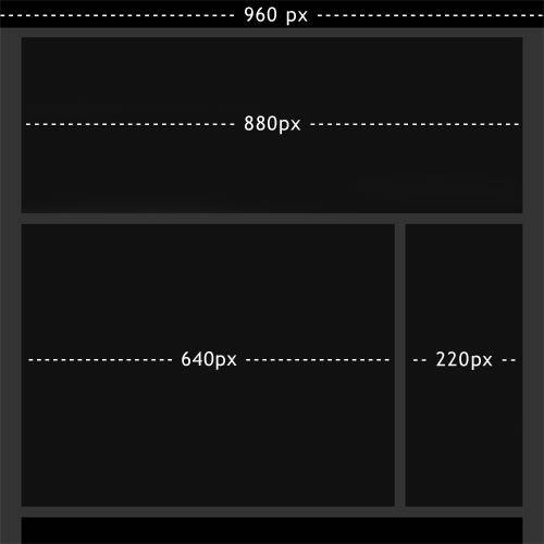 從上述簡單的布局中,我們可以看到如何在css中規(guī)劃代碼。960px是我們的固定寬度,對于任何小于該尺寸的分辨率屏幕,我們將迫使水平滾動(dòng)條出現(xiàn)。所有內(nèi)容在一個(gè)880px的wrapper里,在左右兩側(cè)有40 px的margin,元素間有20px的間距。