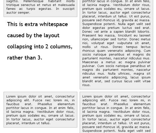 在較小分辨率下查看相同的布局,布局變成了兩欄。但是,在這種情況下,我們得了不同的空白。任何設(shè)計(jì)師覺得這是一個(gè)尷尬的問題。通常情況下,因?yàn)闆]有可行方案解決此問題,這種布局被強(qiáng)行設(shè)置成固定寬度。