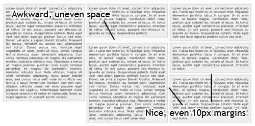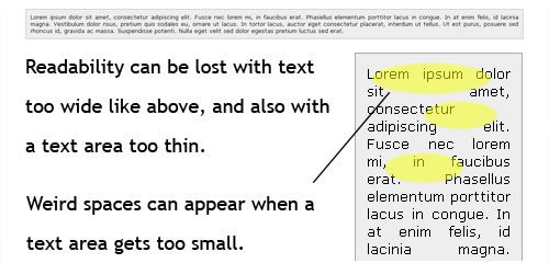 另外一個(gè)流動(dòng)布局關(guān)注的常見問題是:文本要么伸展要么擠壓以致失去了可讀性。下面的這張圖片表明了這個(gè)問題,無論是在大屏幕還是在小屏幕上都是一樣,在小屏幕上似乎問題更大--文本間隙太大,上面這些情況都令用戶沮喪。