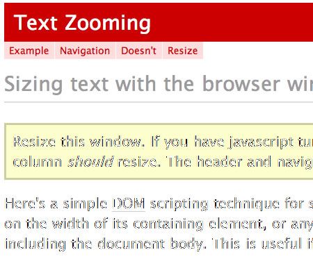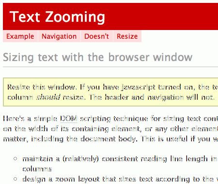 要看實(shí)際效果,可以到他的Text Zooming page. 頁。正如你所看到的那樣,腳本很好的退化,在較大分辨率屏幕上大文本容易閱讀,就像在小屏幕上小文本易于閱讀一樣。更重要的是,標(biāo)題和導(dǎo)航并不改變大小,所以元素可以決定那個(gè)元素應(yīng)當(dāng)使用文本縮放。