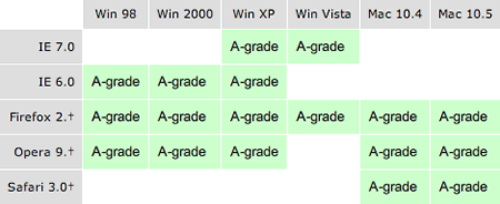 本框架代碼適用于所有由yahoo評(píng)為A級(jí)(A-grade)的瀏覽器。本文發(fā)文時(shí)間,yahoo對瀏覽器的評(píng)定情況如下圖所示。