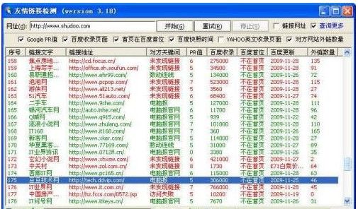 軟件操作非常簡單,運行軟件后只需輸入自己網站的網址,點擊“開始”后便自動開始檢測。軟件自動檢測對方網站的收錄、PR值等信息。如果嫌軟件太麻煩,還可以登錄http://link.chinaz.com,進行在線檢測。