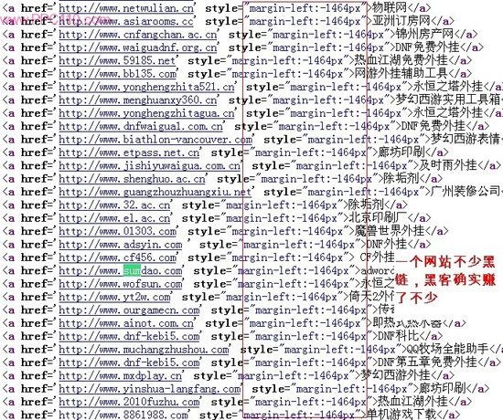 黑鏈的代碼有一定規(guī)律性,這個(gè)掛黑鏈的方法已經(jīng)被Google覺察。代碼截圖如下: