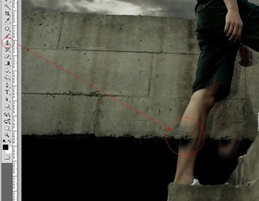 我們首先要用仿制圖章工具將腿部去掉,露出后面的墻體。
