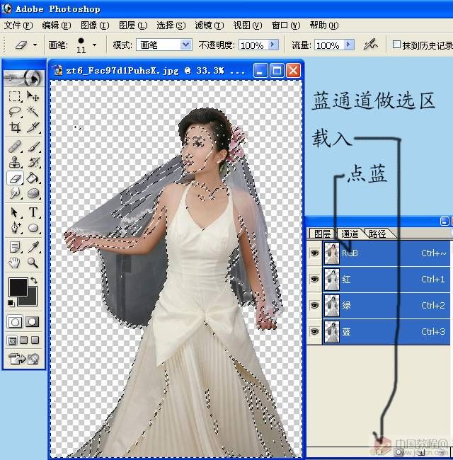 婚紗摳圖方法有很多,通道摳圖是個(gè)不錯(cuò)的選擇。大致過程:先需要用鋼筆等工具把人物部分摳出來包括婚紗部分。然后把摳出的人物圖層復(fù)制一層,在通道選區(qū)婚紗部分較為清晰的通道并調(diào)出選區(qū),回到圖層面板后把選區(qū)反選按刪除高光部分以外的圖像,得到的圖像就是我們摳出的婚紗部分,后期再適當(dāng)調(diào)亮即可。
