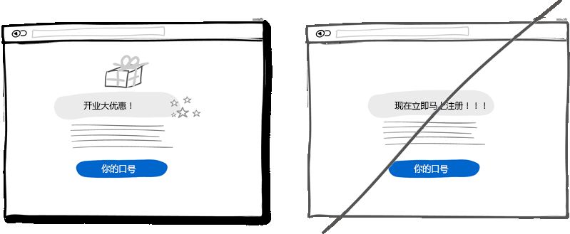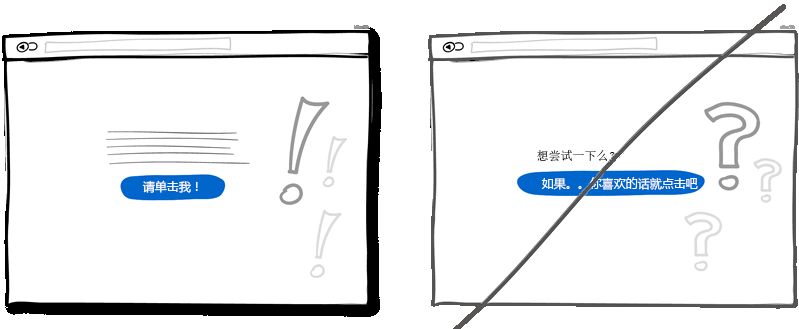 你可以通過不確定而顫抖的聲音來表達(dá)傳遞自己的意思,當(dāng)然也可以通過很自信的方式表達(dá)。如果你在界面中的表述用語多以問號(hào)結(jié)束,比如"也許","可能","感興趣?" 或者"想要試試么?",那么你完全還可以把語氣變得更堅(jiān)定一些。不過萬事無絕對(duì),或許適當(dāng)放松措詞讓用戶有自行思考的余地也是可以的。
