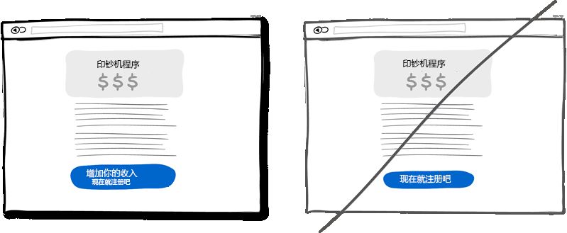 試想界面上有這樣兩個(gè)按鈕:一個(gè)是"獲取折扣",另一個(gè)是"立即注冊"。我敢打賭大多數(shù)人會(huì)點(diǎn)擊第一個(gè),因?yàn)榈诙€(gè)按扭讓人感覺不到有利可圖,并且"注冊"讓人聯(lián)想到填不完的表單。也就是說讓用戶感受到獲利的按鈕更有可能被點(diǎn)擊。這種讓用戶感到好處的文字信息也可是放在按鈕旁邊,不一定要做為按鈕的標(biāo)題。當(dāng)然,正常的按鈕還是有用處的,一般用于重復(fù)性操作頻繁的地方。