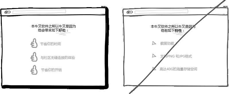 市場就是這樣的,用戶永遠(yuǎn)只關(guān)心自身利益而產(chǎn)品特性對(duì)他們來說倒不是那么重要。只有利益才更直觀地體現(xiàn)出使用產(chǎn)品所帶來的價(jià)值。Chris Guillebeau在他的著作《100美元起家》中指出,相比壓力,沖突,煩心事和未知的未來,人們在乎得更多的是愛,金錢,認(rèn)同感和自由支配的空閑時(shí)間。所以我相信在展示產(chǎn)品特性時(shí)回歸到利益上是必要的。