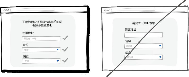 適當(dāng)?shù)哪J(rèn)值和預(yù)先填充好的表單字段可以大量減少用戶的工作量。在節(jié)省用戶寶貴的時(shí)間上面,這是種非常常見的做法,可以幫助用戶快速填完表單或者注冊信息。