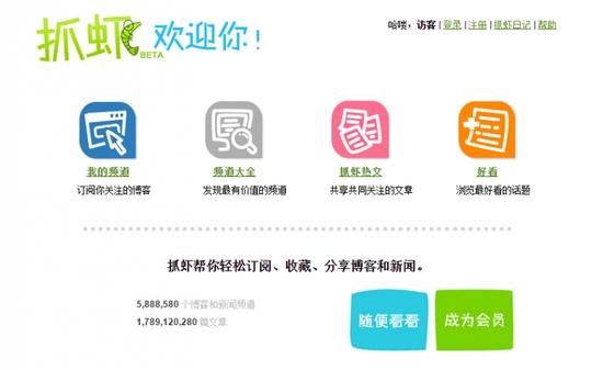 抓蝦是一個(gè)RSS在線閱讀訂閱站點(diǎn),它能幫助互聯(lián)網(wǎng)用戶訂閱、收藏、分享自己關(guān)注的博客與新聞,讓網(wǎng)民一站獲得這些資訊的更新消息。